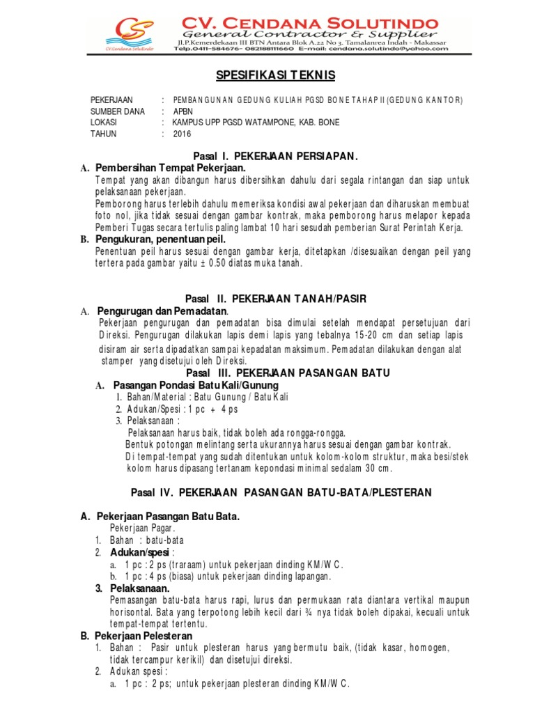 Contoh Spesifikasi Kerja Bangunan